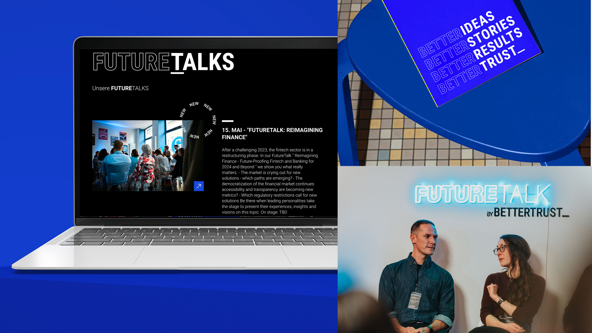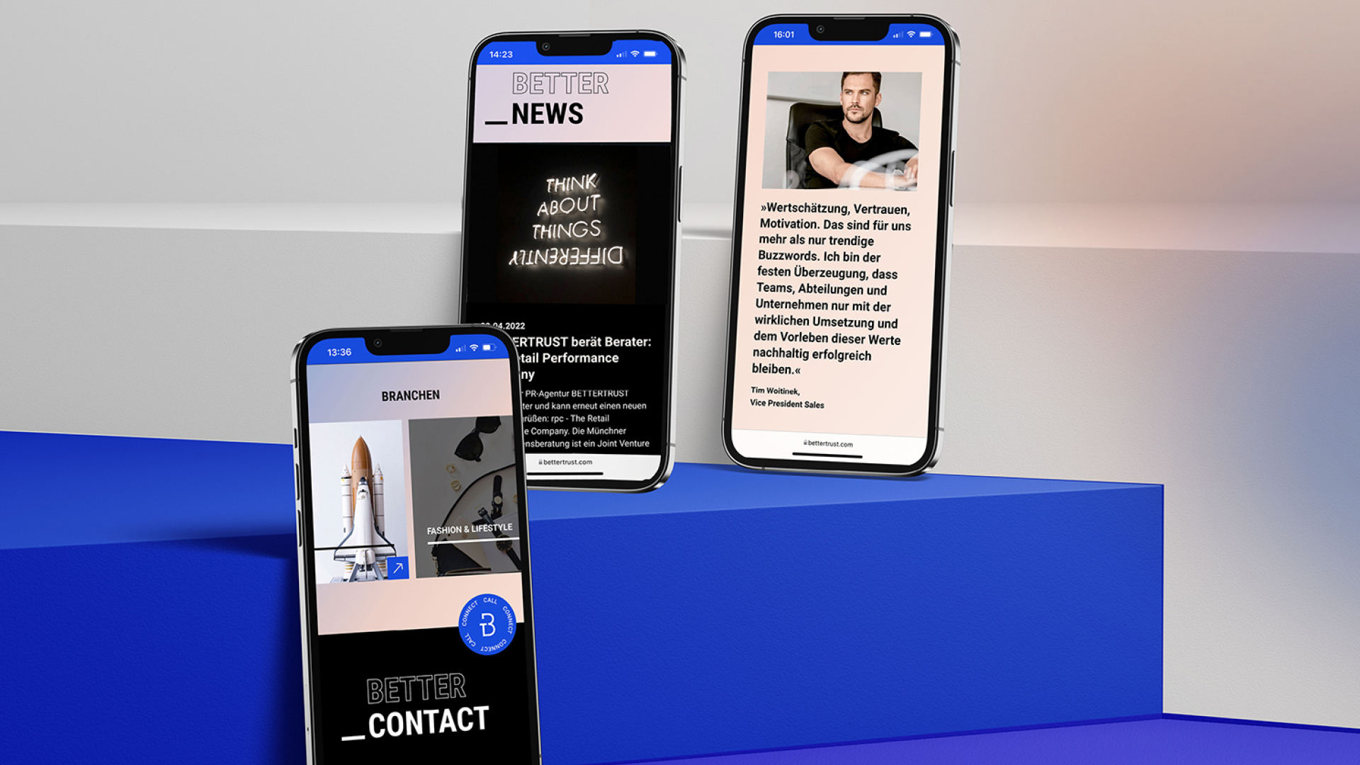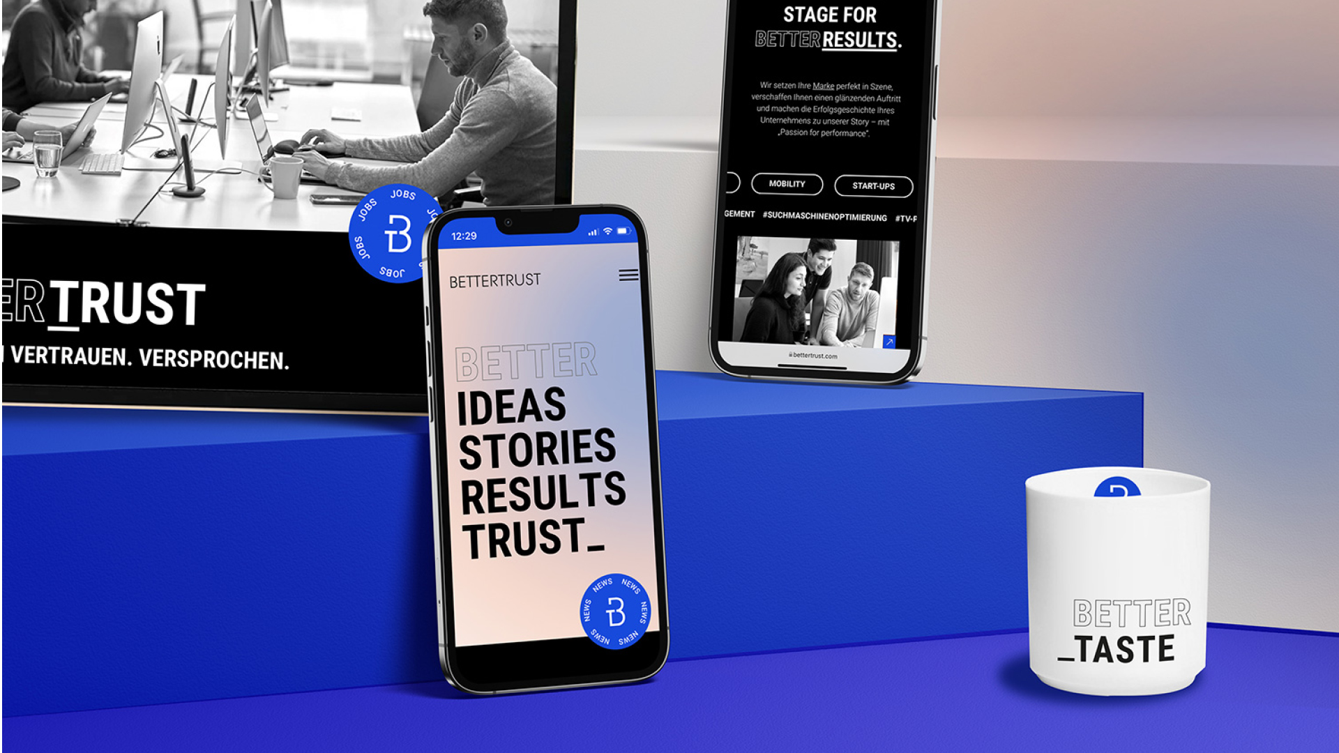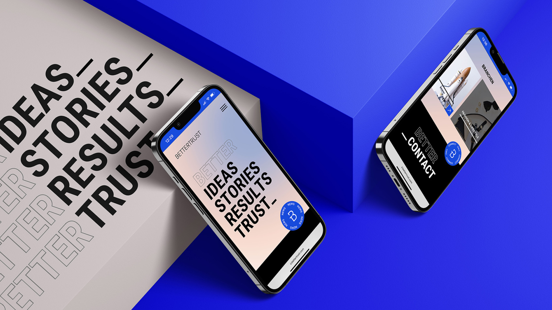Für die führende Kommunikationsagentur Bettertrust haben wir ein Design entwickelt, das den Premiumanspruch der Marke sichtbar macht. Im Zentrum steht der neue Claim: „Betterideas, Betterstories, Betterresults, Bettertrust“ – ein kraftvolles Leitmotiv, das die Dynamik und das Selbstverständnis der PR-Profis transportiert.