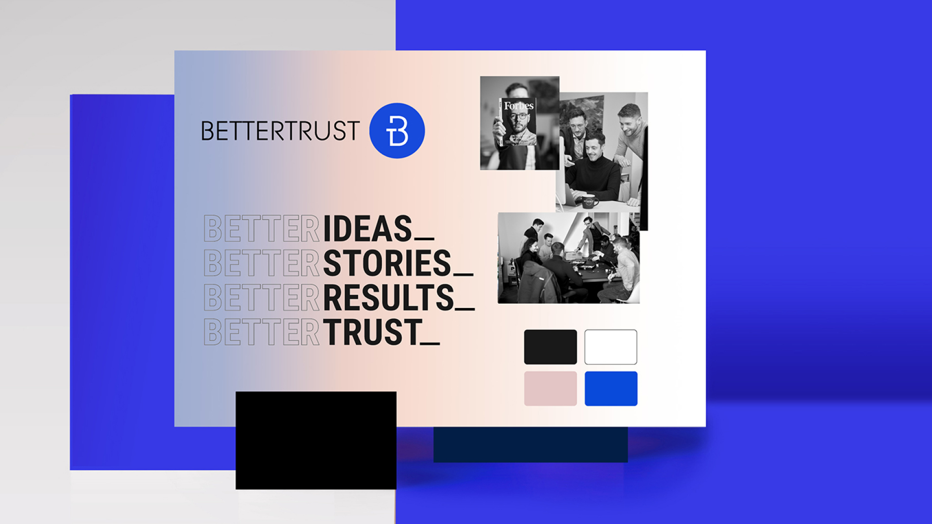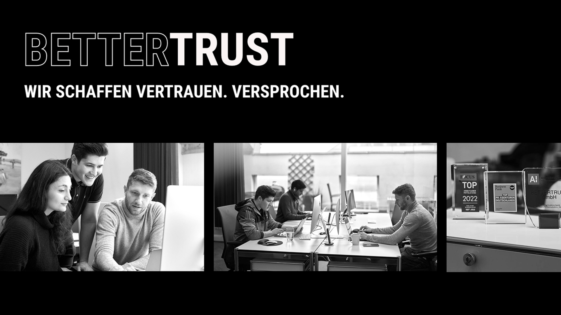 Das reduzierte Design in Schwarz-Weiß wirkt bewusst markant, strahlt zugleich Vertrauen und Solidität aus. Es positioniert Bettertrust als moderne, souveräne Agentur auf Augenhöhe mit ihren Kunden.